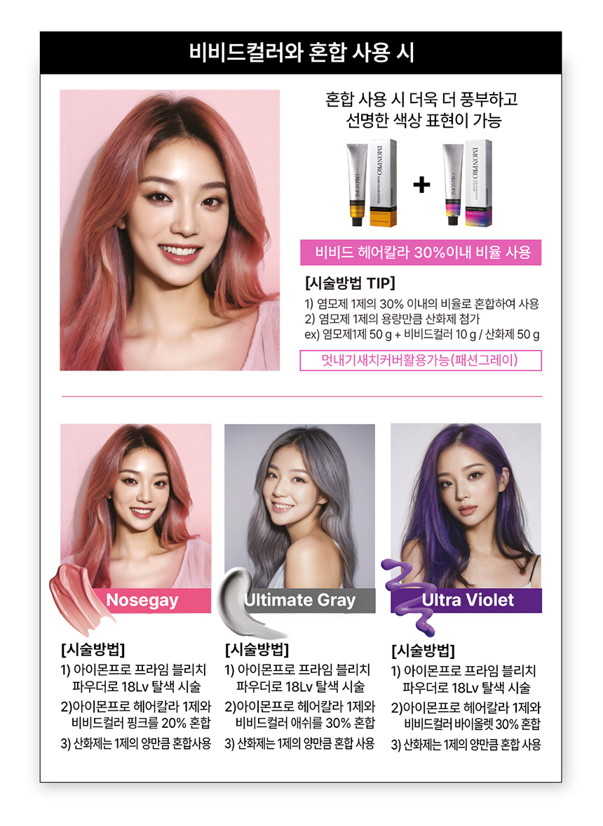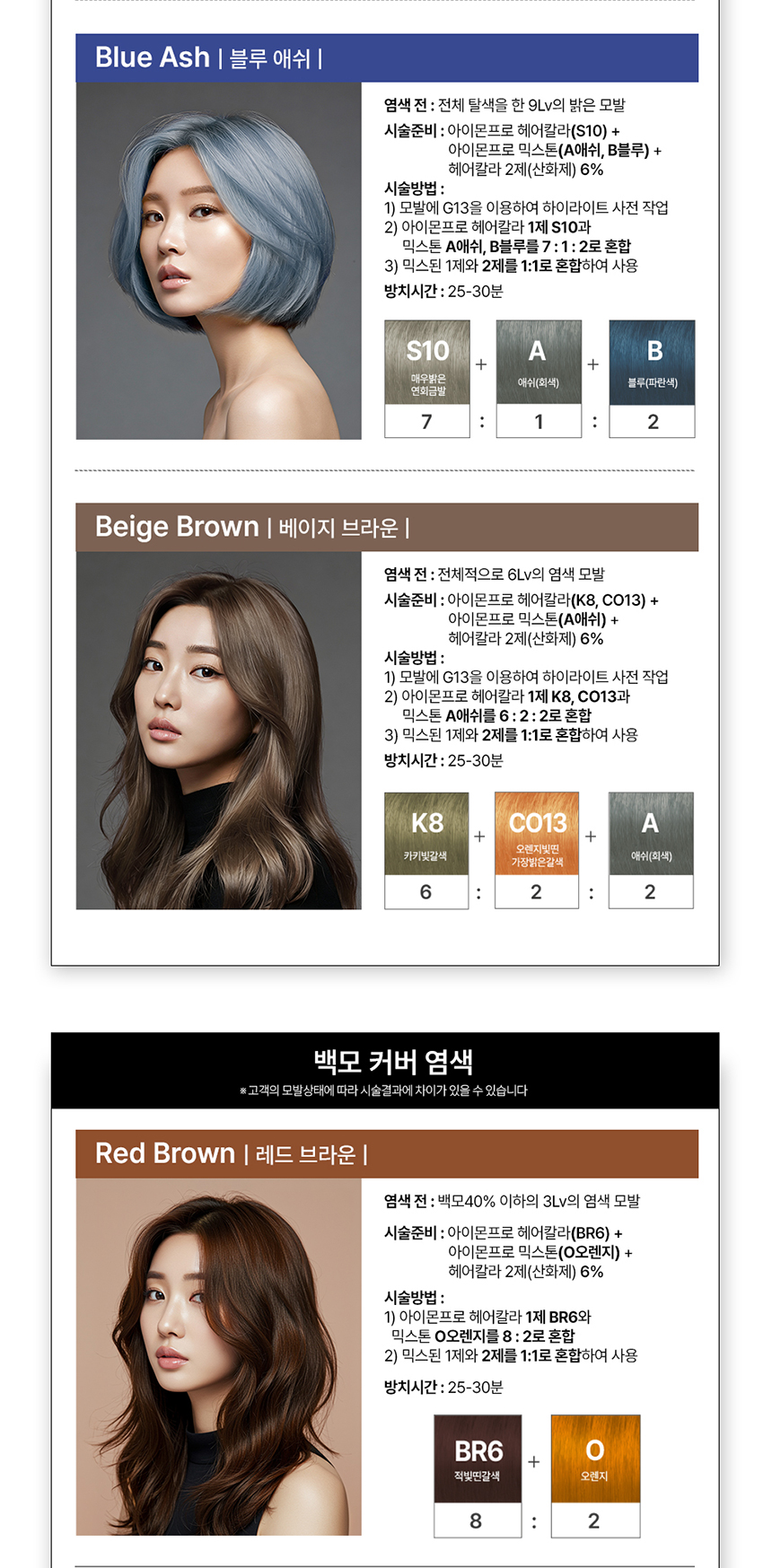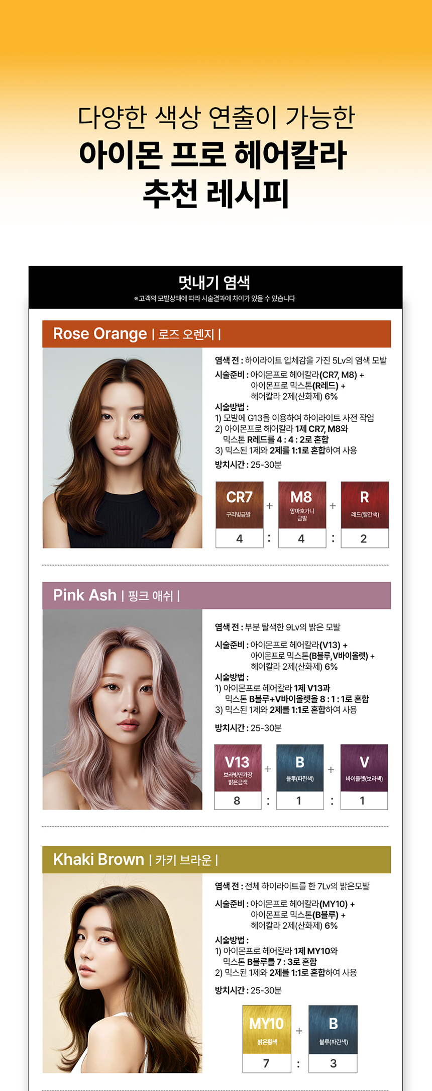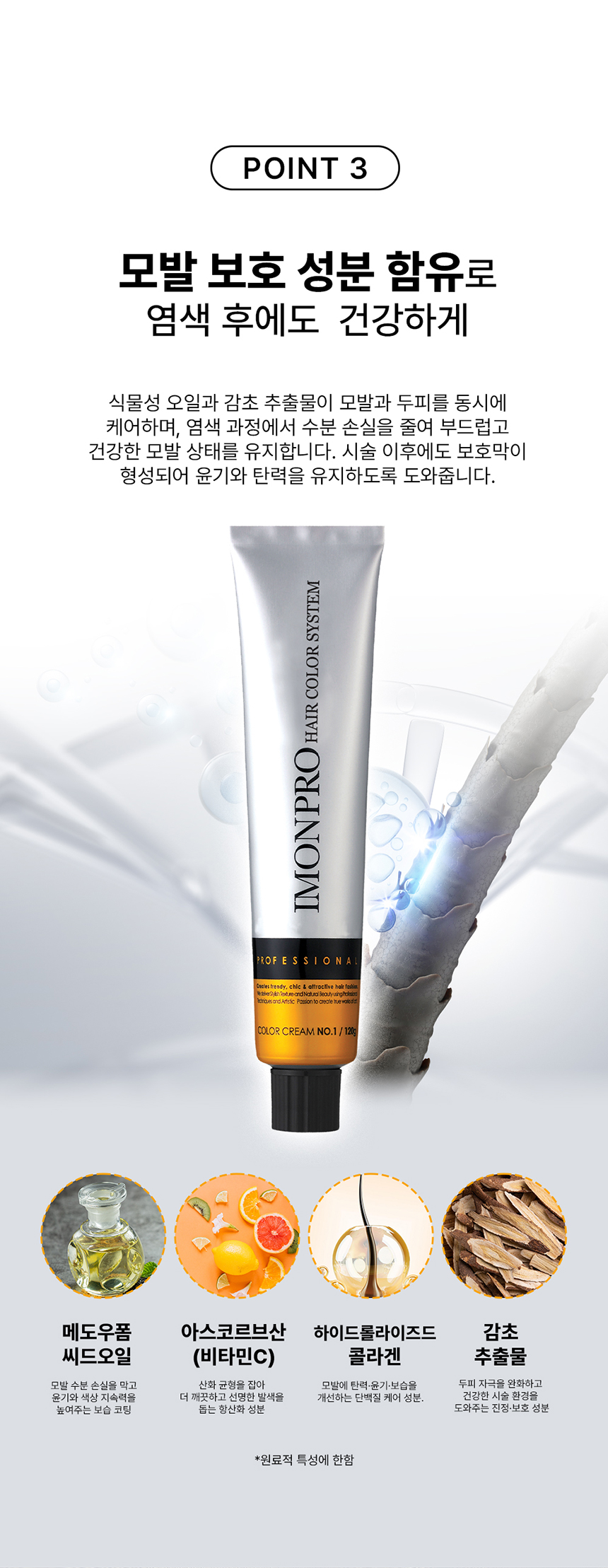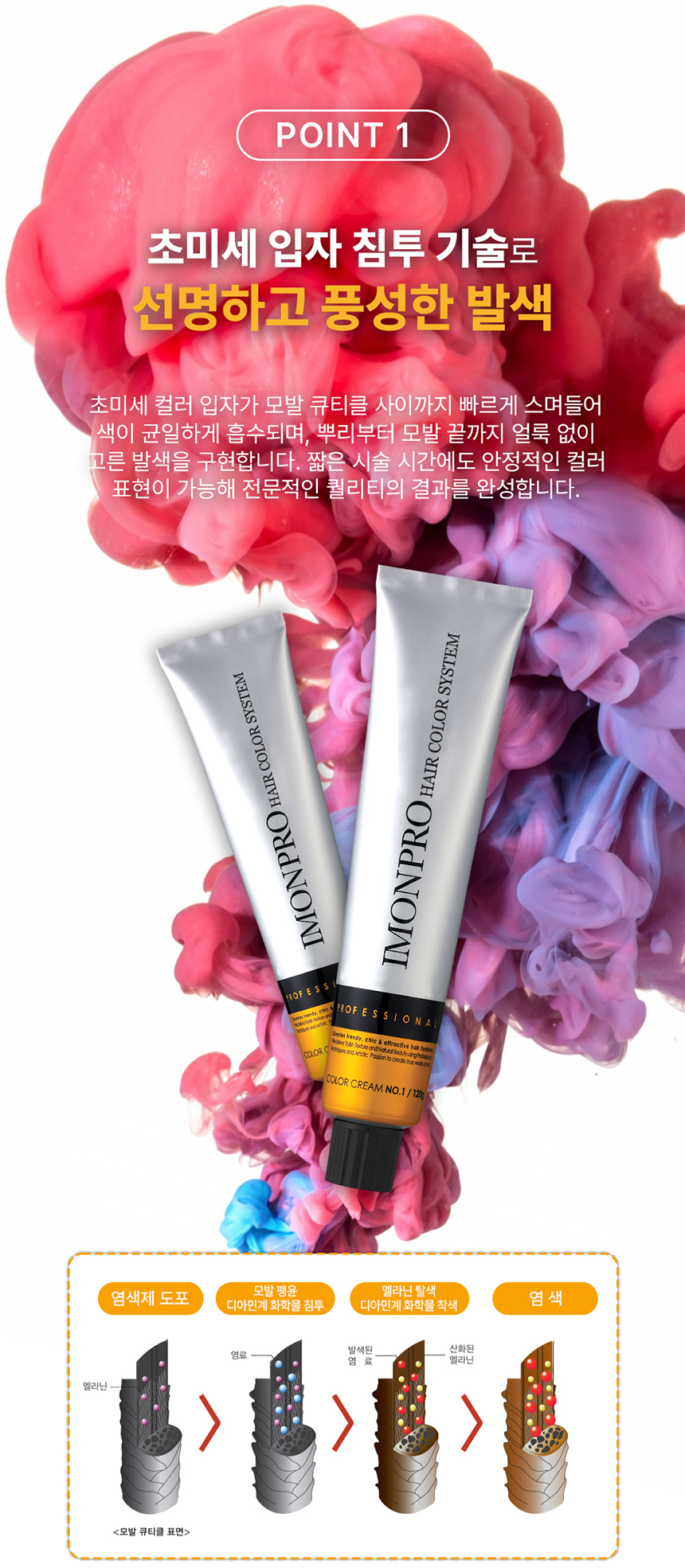 | 제품의 사용목적/방법 | ◎자연모 염색 -아이몬프로 헤어칼라 혼합액을 모발에 뿌리에서 끝부분까지 도포합니다. -얼룩이 생기지 않도록 모발 전체에 혼합액을 균일하게 펴 바릅니다. -모발에 열을 가하지 않고 30분간 자연방치한 후 미온수로 혼합액을 잘 씻어냅니다. ◎염색및 펌모발 -아이몬프로 헤어칼라 혼합액을 새로 자라난 모발의 뿌리 부분에 바르고 15분 가량 펴 바릅니다. -나머지 모발 부분에 얼룩이 생기지 않도록 균일하게 바르고 10분 가량 자연방치한후 미온수로 혼합액을 잘 씻어냅니다. |