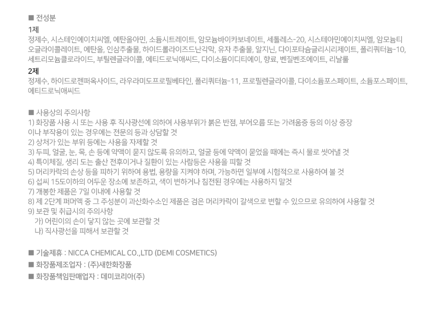 제조자/제조판매업자 기술제휴 : NICCA CHEMICAL CO.,LTD (DEMI COSMETICS) / 화장품제조업자 : (주)새한화장품 / 화장품책임판매업자 : 데미코리아(주)