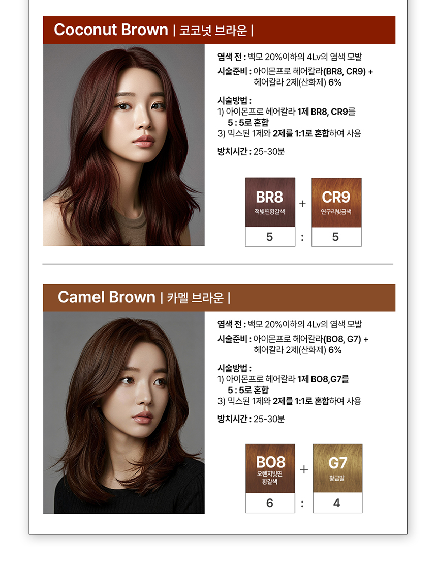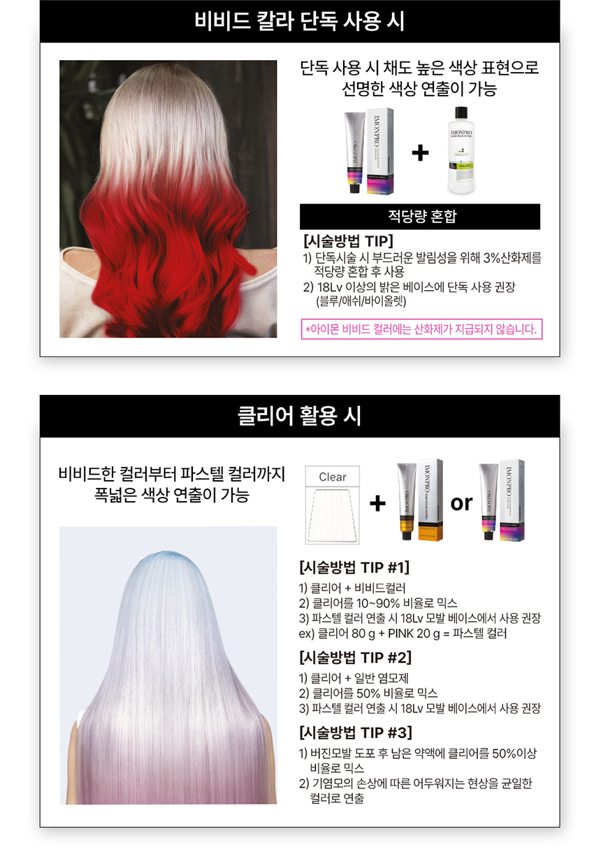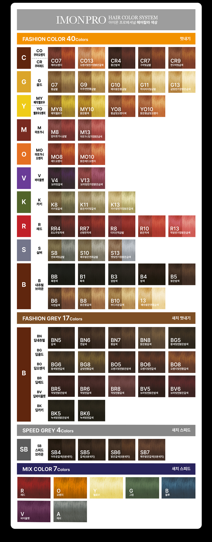 | 제품의 사용목적/방법 | ◎자연모 염색 -아이몬프로 헤어칼라 혼합액을 모발에 뿌리에서 끝부분까지 도포합니다. -얼룩이 생기지 않도록 모발 전체에 혼합액을 균일하게 펴 바릅니다. -모발에 열을 가하지 않고 30분간 자연방치한 후 미온수로 혼합액을 잘 씻어냅니다. ◎염색및 펌모발 -아이몬프로 헤어칼라 혼합액을 새로 자라난 모발의 뿌리 부분에 바르고 15분 가량 펴 바릅니다. -나머지 모발 부분에 얼룩이 생기지 않도록 균일하게 바르고 10분 가량 자연방치한후 미온수로 혼합액을 잘 씻어냅니다. |