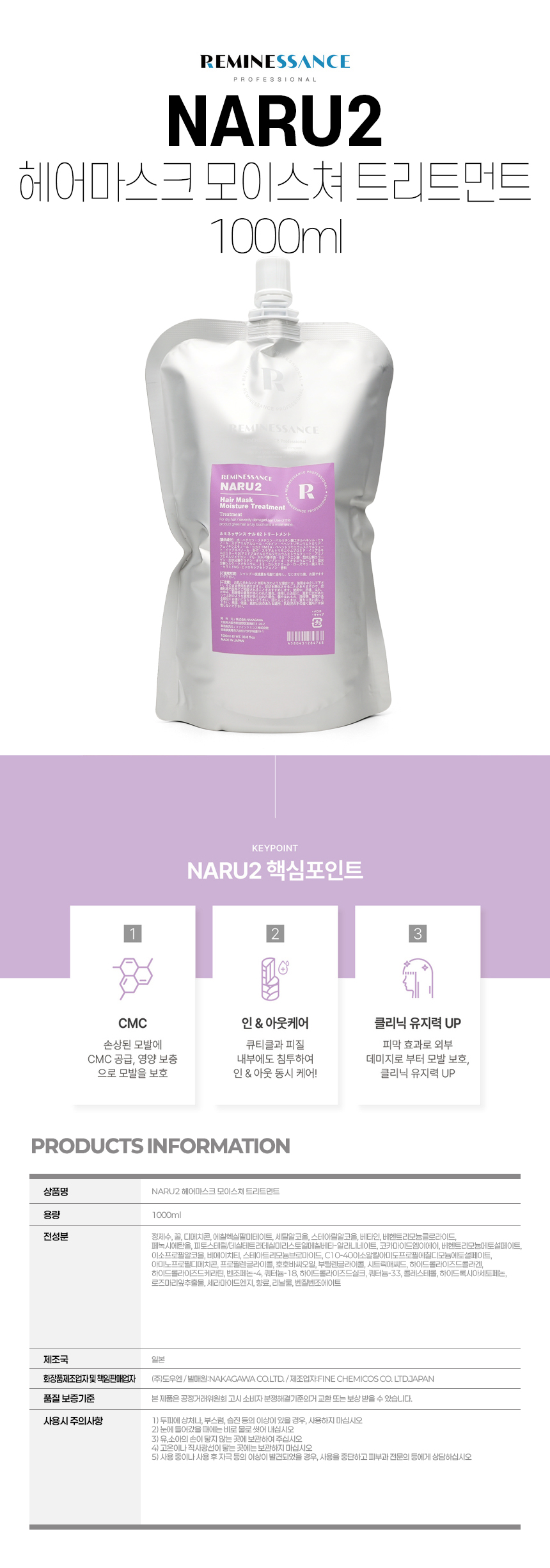 [르미네상스] NARU2 헤어마스크 모이스쳐 트리트먼트 1000ml (구:아이레06)